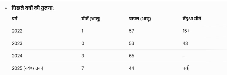 - भालू हमले: 71 मौतें (2000 से कुल), 2009 घायल। 2025 में 7 मौतें, 44 घायल। पौड़ी में 1 मौत, 12 घायल।